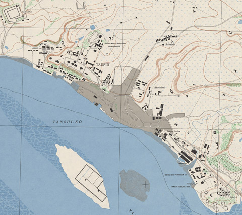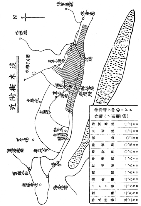 この写真は大正から昭和初期の写真であると思われるが、左手前で河口から来た路が左斜めに曲がってその両側に出来た空所に木が立っているのが判る。